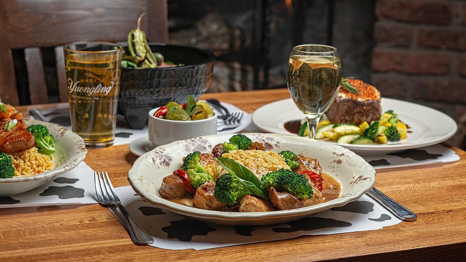 tasty, pan-roasted breaded chicken breast with fresh lemon sauce, capers, & anchovies, served with Barnmade herb spaetzle & red cabbage